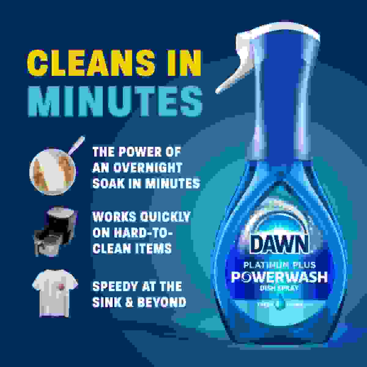 Dawn Powerwash Dish Spray removes up to 99% of grease and grime in half the time.* Powerwash has 3 cleaning boosters not found in traditional dish soaps that remove food and grease 5X faster.** And because it cleans so well, you can replace multiple cleaning products around your home for counters, stoves, grills, and stains on laundry. Powerwash delivers the power of an overnight soak in minutes. For everyday messes, just spray the suds on and wipe, no water needed until rinsing. For tougher messes, let the suds sit a few minutes before wiping. Save money and reduce waste by reusing your sprayer. Convenient refills available in a variety of scents.