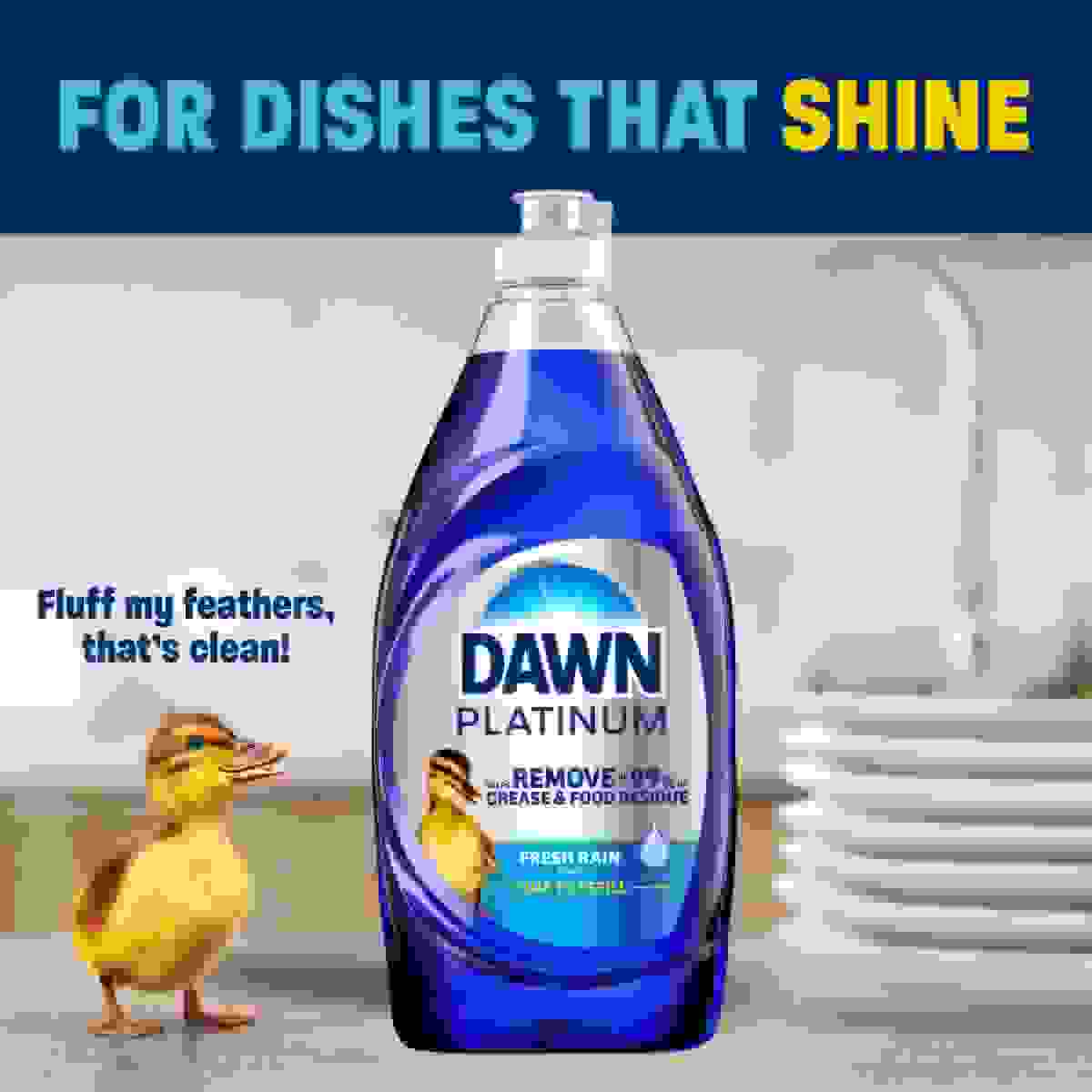Dawn Platinum gives you a squeaky clean that you can see and feel. Dawn Platinum's improved formula easily removes 99% of grease and food residue. Dawn is tough on grease, but gentle. Gentle enough that Dawn is the only brand of dish soap trusted by rescue workers to clean wildlife impacted by oil spills. For more than 40 years, Dawn has helped save wildlife both at the sink, with products designed to get dishes cleaner faster, using less water*, and at the shore, where we work with wildlife rescue experts to protect and care for aquatic wildlife. Dawn dishwashing liquid can even be used to clean items beyond the kitchen sink. Use Dawn Platinum dish soap to pre-treat greasy laundry stains, remove grease and grime from kitchen counters and appliances, and to clean external car surfaces and the outer shroud of a gas grill. Dawn Ultra's powerful formula helps you get through more dishes with less** dishwashing liquid. Made with biodegradable surfactants. #1 Brand*** in North America.