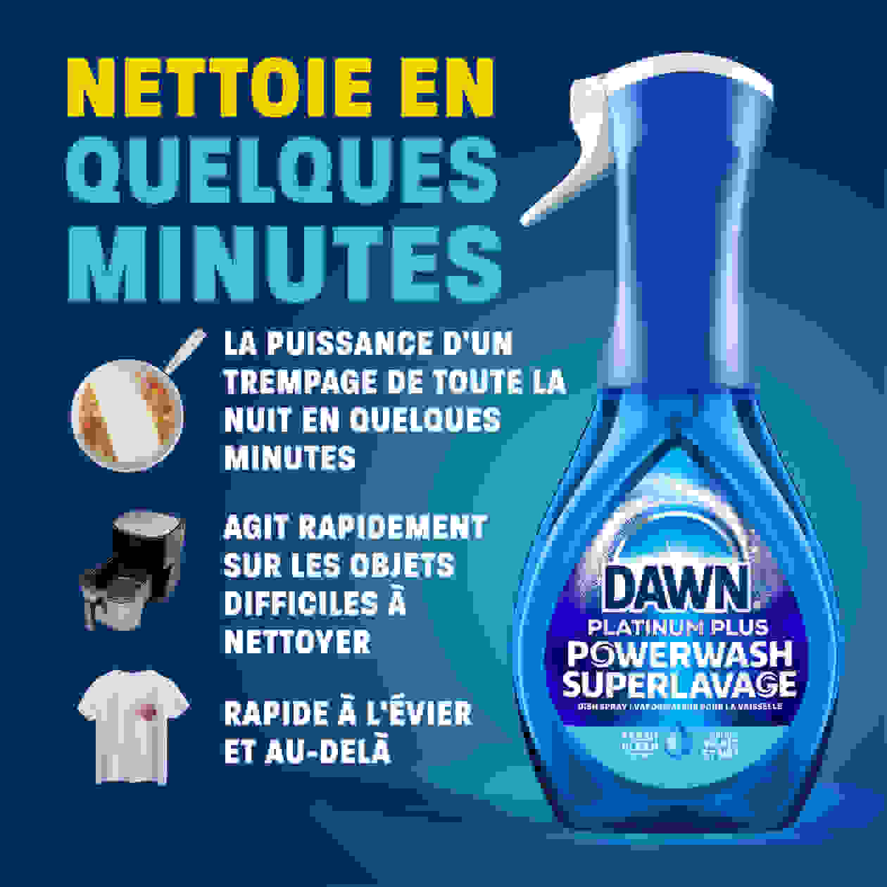 Le vaporisateur à vaisselle Dawn Superlavage élimine jusqu’à 99 % de la graisse et de la saleté en deux fois moins de temps*. Il contient trois rehausseurs de nettoyage qu’on ne trouve pas dans les savons à vaisselle traditionnels et qui permettent d’éliminer les aliments et les graisses cinq fois plus rapidement**. Et puisqu’il nettoie si bien, vous pouvez remplacer un éventail de produits de nettoyage dans votre maison pour les comptoirs, les cuisinières, les barbecues et les taches sur les vêtements. Superlavage offre la puissance d’un trempage de nuit en quelques minutes. Pour les dégâts quotidiens, vous n’avez qu’à vaporiser et frotter. Aucune eau requise avant de rincer. Pour les aliments collés plus tenaces, laissez la mousse travailler pendant quelques minutes avant d’essuyer la vaisselle. Économisez de l’argent et réduisez le gaspillage en réutilisant votre vaporisateur. Des recharges pratiques sont offertes dans une gamme de parfums.